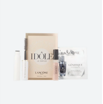 Receive deluxe samples of Idôle Le Parfum (0.04 oz.), Génifique Ultimate Recovery Serum (0.03 oz.) and Cils Booster XL Enhancing Lash & Mascara Primer (0.07 oz.) with your $125 Lancome purchase.