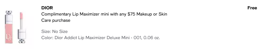 Macy’s (NEW) DIOR Complimentary Lip Maximizer mini with any $75 Dior Makeup or Skin Care purchase. DIOR Complimentary Miss Dior pouch with any $150 Dior Women’s Fragrance and Body Care purchase.