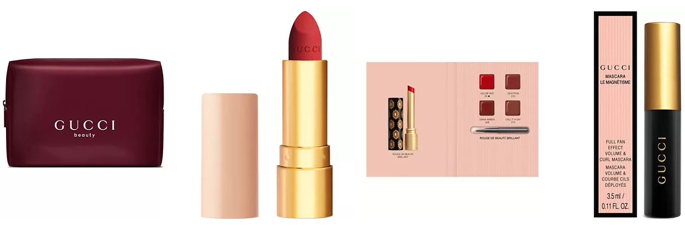 Free Gucci Pouch with a $165 Gucci Women’s fragrance purchase. Free Gucci Matte Lipstick Goldie Red 025 with any $65 Gucci Beauty Purchase. NEW! Free Gucci Makeup Sample Card with any purchase from the Gucci Makeup Collection. Free Gucci Makeup Mini Mascara with any $95 Gucci Beauty Purchase