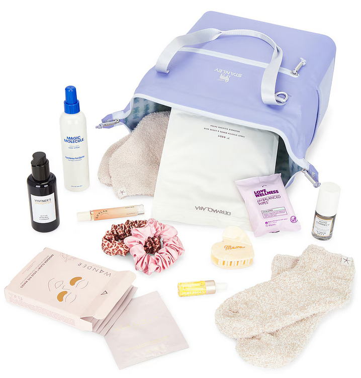 Includes the Barefoot Dreams Cozychic 2 Pair Tennis Sock Set in Stone Multi, Dermaclara Belly & Body Occlusion Patch, Love Wellness pH Balanced Wipes and pH Balanced Wipes 15 Pack, Magic Molecule Hypochlorous Acid Spray (8 oz), Pure Mama Belly & Body Oil and Deluxe Mini Belly Oil, Skylar Nude Skin Roller Ball, slip Bridget Duo, STANLEY Julienne Midi in Hydrangea, Solar Eclipse Hand-Painted Mama Heart Acetate Claw Hair Clip, Sunday Riley Auto Correct Brightening and Depuffing Eye Contour Cream, Wander Beauty Baggage Claim Gold Eye Mask 6 Pack, and Vintner’s Daughter Active Renewal Cleanser.