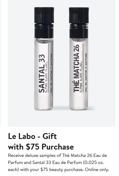 Get deluxe samples of Thé Matcha 26 Eau de Parfum and Santal 33 Eau de Parfum (0.025 oz. each) with any $75 beauty purchase.