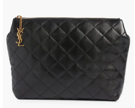 NORDSTROM – Saint Laurent Large Cassandre Leather Cosmetics Bag $950. Quilting enhances the luxe look and feel of a leather zip pouch featuring a gleaming monogram zipper pull and room enough for daily-routine supplies. Size info: 9 ¾”W x 8 ½”H x 2 ¾”D.