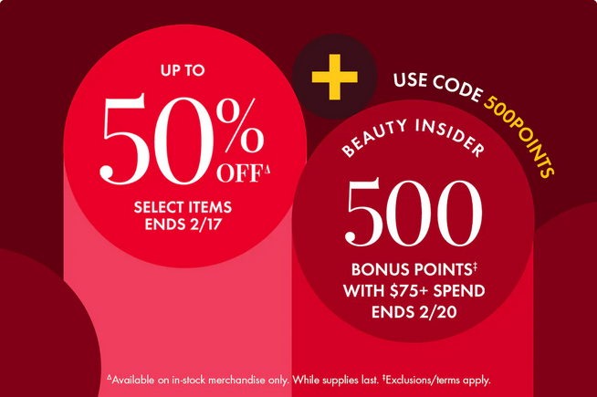 Sephora (NEW) 500 bonus points with $75 minimum spend use code 500POINTS, get 50% off select mascaras, up to 50% off select beauty, AND FREE Same-Day Delivery use code GETITNOW. Brands including Patrick Ta, Glossier, Natasha Denona, Ilia and more. Explore Sephora coupon page. There are new items in the SEPHORA Rewards Bazaar, you can use Sephora points to redeem for free.