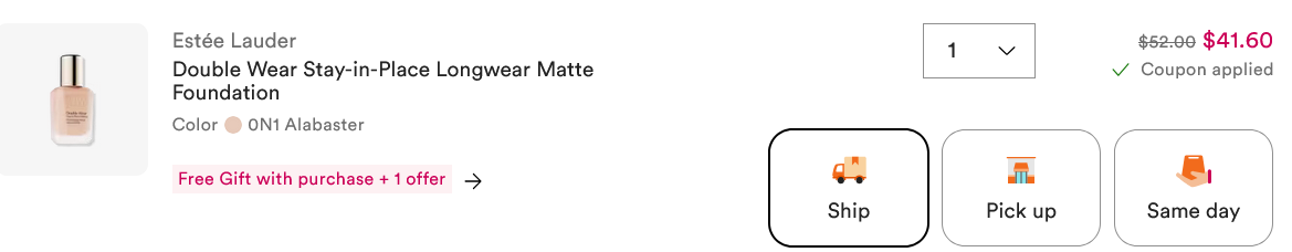 - Estee Lauder at Ulta (Ulta direct link only $41.60 with coupon). Get 20% off QUALIFYING purchase use coupon 914833 – see printable version coupon here. Ends Feb 28. Explore all gift with purchase offers. Free mystery gift with select offer. Plus, get a free Double Wear Foundation Pump with your foundation purchase ($15 value).