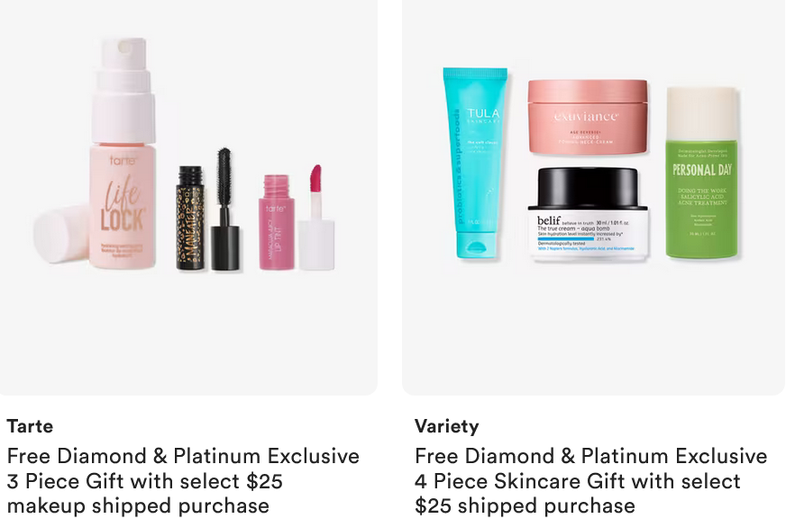 - Free Diamond & Platinum Exclusive 3pc deluxe Tarte gift with $25 makeup purchase.