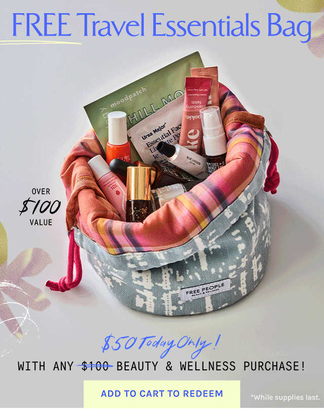 - Free People — Free People Travel Essentials Bag $100, FREE with any $50+ Beauty and Wellness purchase. Add to cart to redeem.