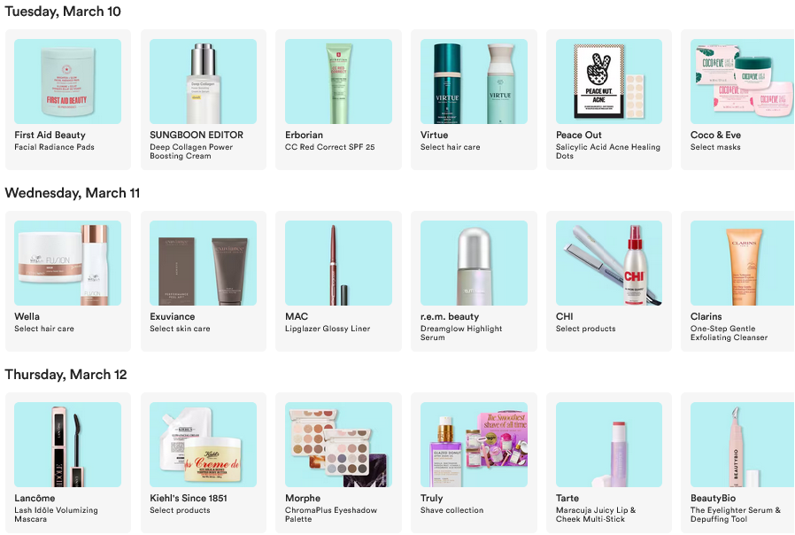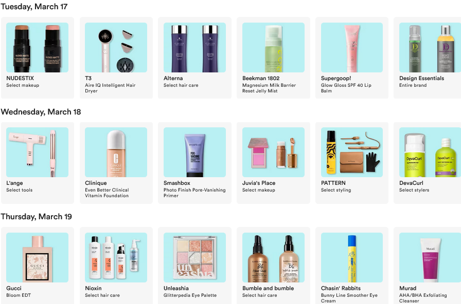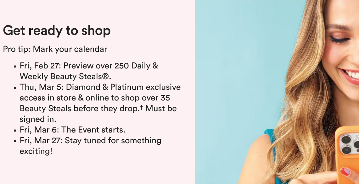 - March 5: Exclusive Diamond & Platinum access in store and online to shop 35+ Beauty Steals.† Must be signed in.