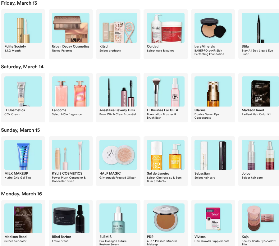 - Watch for Ulta 21 Days of Beauty Surprise Steal throughout the event.