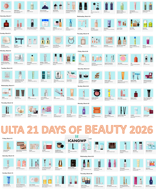 Ulta‘s 21 Days of Beauty Event is coming March 6-26, 2026, offering 50% off 250+ daily beauty steals, including Weekly Steals at ulta.com/21-days-of-beauty. The bi-annual Ulta 21 Days of Beauty Event is one of the retailer’s biggest sale events of the year.