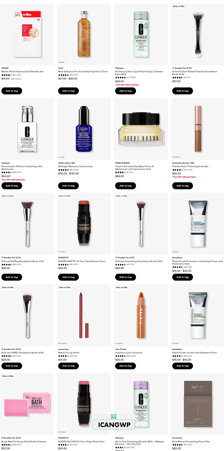 - Freebies, such as a Ulta: free gift with $50 or Ulta free gift with $80 purchase