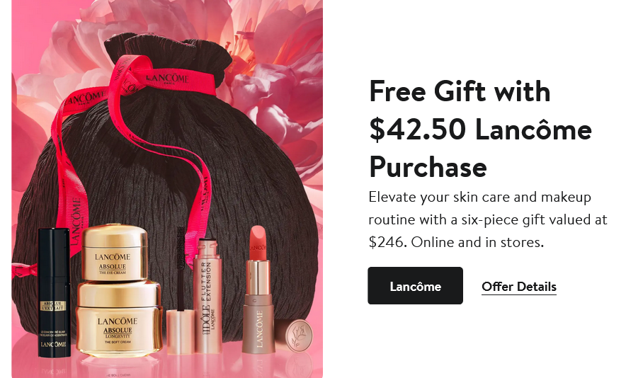 Alternatively, Lancome gift with purchase at Bloomingdale’s LIVE NOW February 18 – March 8, 2026 and while supplies last. Receive a 7-piece gift (a $152 value) with any $42.50 Lancome purchase. Get a free 3pc step-up gift on $80 purchase. Get 15% Off almost any $150+ beauty purchase.