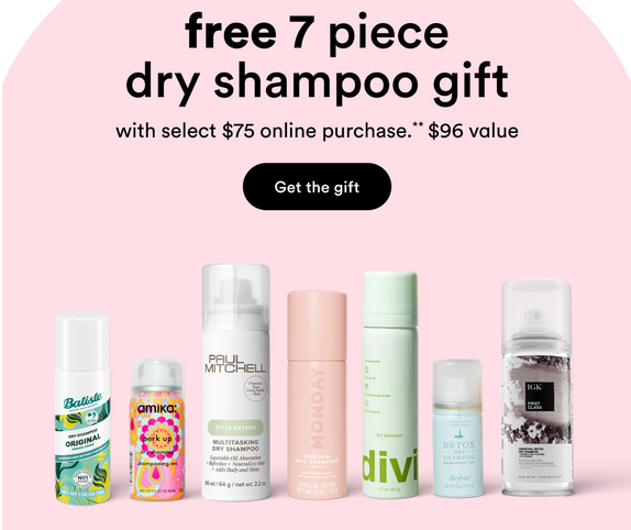 Ulta GIFT 1: Free 7 Piece Dry Shampoo Gift with select $75 shipped purchase only at Ulta.com.