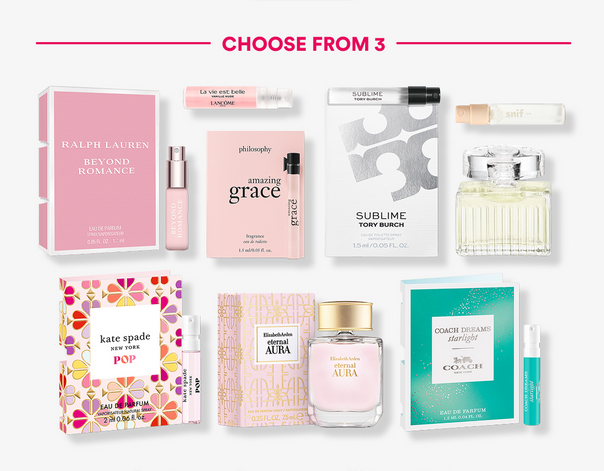 - Choose a free 9-piece fragrance sample bag with select $85 purchase – 3 options.
