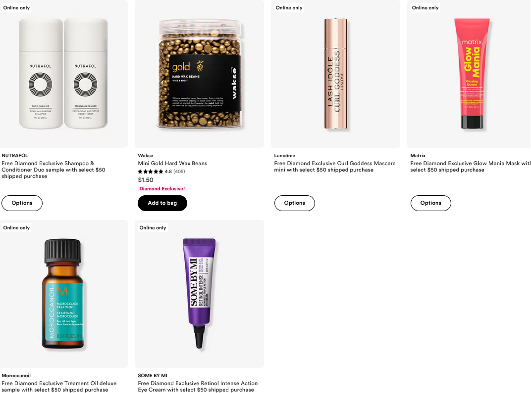 - Choose a free Diamond Exclusive Weekly Gift with any $50 shipped purchase – 6 options.