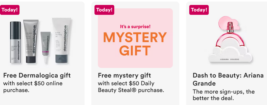 - Ulta‘s 21 Days of Beauty Event is here through March 26, 2026, offering 50% off 250+ daily beauty steals. NEW beauty GWPs TODAY: Dermalogica Free Beauty Break 4 Piece Gift with select $50 shipped purchase. Free mystery gift with select $50 Daily Beauty Steal shipped purchase -OOS. Dash to Beauty up to 50% off page – Ariana Grande Cloud Pink Eau de Parfum (reg. $72) – Up to 50% off.
