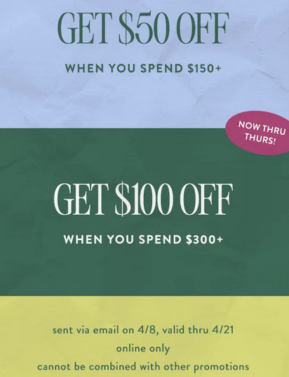 - Anthropologie Sale is here through March 26. Get $50 off when you spend $150 or get $100 off when you spend $300, send via email by 4/8 and valid through 4/21.