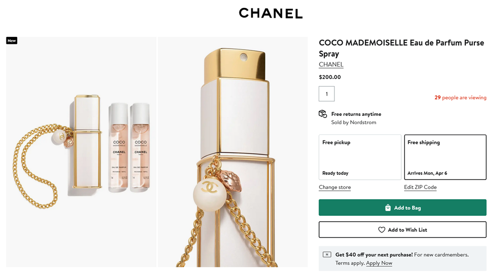 NORDSTROM just released a new limited‑edition CHANEL COCO MADEMOISELLE Purse Spray Set, designed like a piece of jewelry with a golden chain, pearl‑like bead, and signature camellia charm. This refillable $200 set is wearable around the wrist and is expected to sell out quickly. Even better, Nordstrom currently has two CHANEL GWPs plus a free 13‑piece skincare set with any $185 beauty or fragrance purchase (worth $193), making this one of the best-value CHANEL Beauty moments of the season.