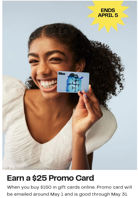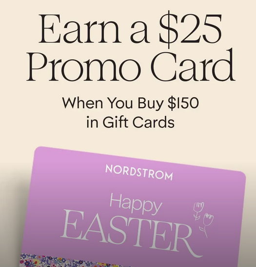 NORDSTROM and Nordstrom Rack Earn a $25 Promo Card When You Buy $150 in Gift Cards Online. Get something for them—and you too. Offer available online only through April 5. Promo card emailed around May 1, and good through May 31. Restrictions apply. See full details here. Online Only Thru April 5.