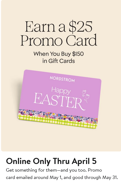 *To qualify for this online offer, digital gift card(s) or physical gift card(s) (“Gift Cards”) must be purchased online in a single transaction between March 26, 2026, at 9:01pm PT and April 5, 2026, at 11:59pm PT (“Promotion Period”) from Nordstrom.com, NordstromRack.com, or the Nordstrom and Nordstrom Rack mobile apps. Minimum cumulative $150 USD purchase of Gift Cards in a single transaction is required to earn a $25 USD promotional card. Only one promotional card per customer may be earned during the Promotion Period. Online offer not valid in Nordstrom stores, Nordstrom Rack stores or Nordstrom Locals. The promotional card will be sent on or about May 1, 2026, to the email address provided at the time of the qualifying purchase. PROMOTIONAL CARD EXPIRES MAY 31, 2026, AT 11:59PM PT. Promotional card valid in Nordstrom stores, Nordstrom Rack stores and Nordstrom Locals, online at Nordstrom.com and NordstromRack.com, and in the Nordstrom and Nordstrom Rack mobile apps. Promotional card cannot be reloaded, redeemed for cash (except as required by law) or applied as payment to any account. Redeemable only up to full value noted. Promotional card is not valid for purchase of physical gift cards or digital gift cards, or toward previous purchases. Promotional card may not be purchased, sold, traded or transferred. Use of the promotional card is acceptance of its terms. Employees of Nordstrom and its affiliates not eligible. Offer subject to modification, cancellation or extension at any time.