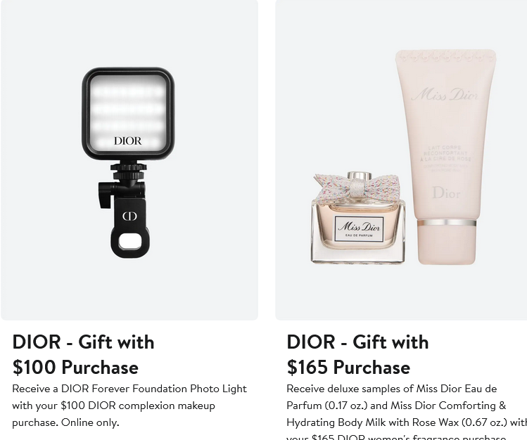 - NORDSTROM has an exclusive DIOR Forever Foundation Photo Light, free with your $100 Dior complexion makeup purchase. They’re also offering two step-up Dior GWPs. Plus, get a FREE 12-Piece Beauty Gift with Purchase when you spend $125 in Beauty & Fragrance. Explore 30 Nordstrom luxury beauty gift with purchase. In addition, earn a $25 Promo Card When You Buy $150 in Gift Cards Online, ends 4/15.
