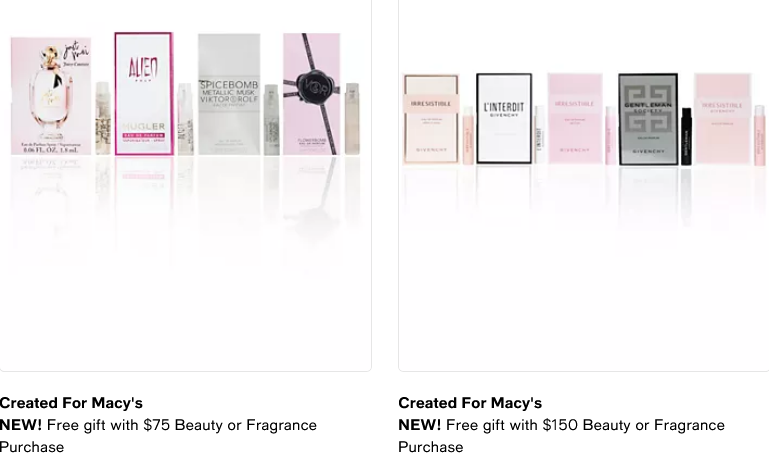 Get a free 4pc fragrance sampler with any $75beauty purchase. Plus, get an additional 5pc fragrance sampler with any $150 beauty purchase. Explore all Macy’s beauty gift with purchase.