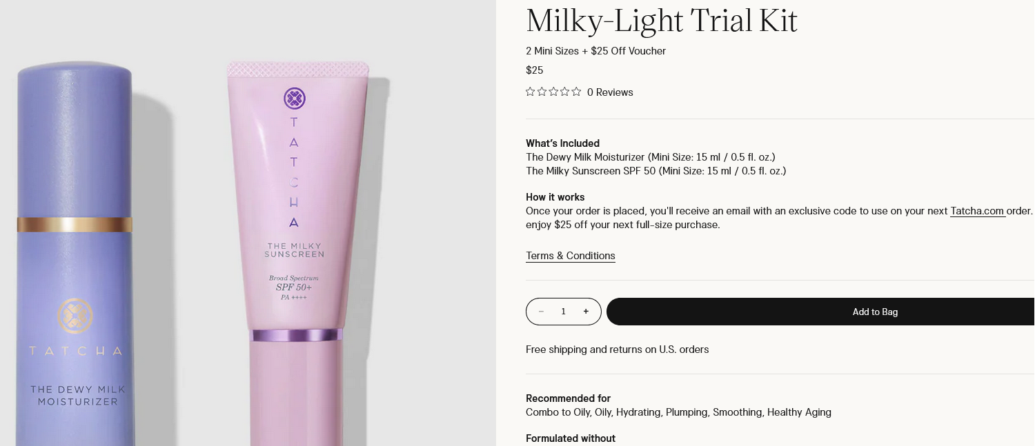 - You can also grab the Tatcha Milky-Light Trial Kit for $25, featuring 2 Mini Sizes + a $25 Off Voucher to redeem on a future purchase.