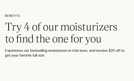 *Offer can only be redeemed by purchasers of the “Find Your Moisturizer Trial Kit”. One voucher per household. Promotions and discounts cannot be applied to select items, previous purchases, gift cards, taxes, shipping or processing charges or combined with any other coupons or discounts. The voucher has no monetary value and may not be redeemed for cash. The voucher is not transferable and may not be auctioned, traded, bartered or sold. Valid on in-stock items only. Cannot be used on orders that include any items on Subscribe & Save or “Curate Your Own Set”. We reserve the right to cancel any order due to unauthorized, altered or ineligible use of offer and to modify or cancel this promotion due to system error or unforeseen problems.