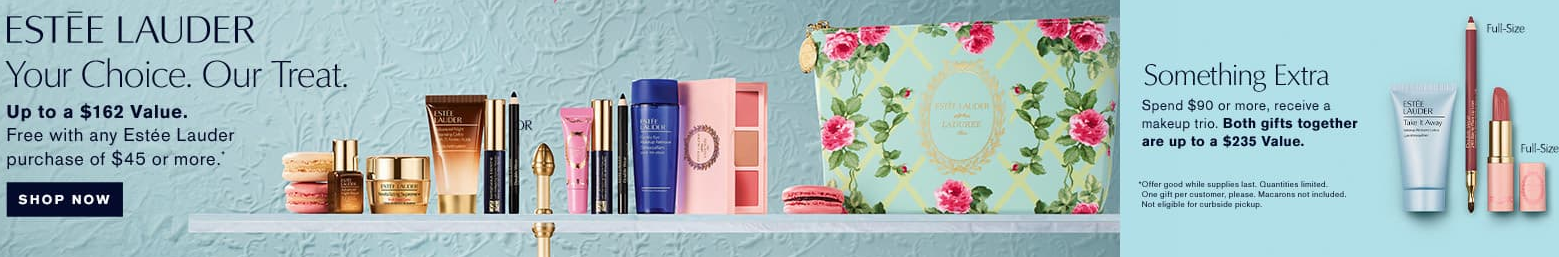 Boscov’s -Choose your free beauty routine with any Estee Lauder purchase of $45 or more. Up to a $162 value. Spend $90 or more on Estee Lauder, receive a makeup trio. Both gifts together worth over $235. An exclusive collaboration with Laduree, the luxury French pastry house.